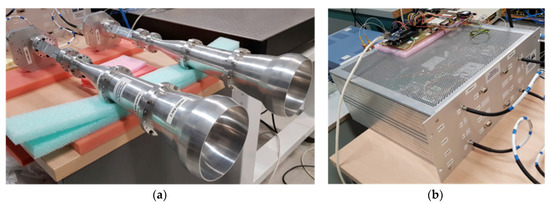 As it is shown in Figure 1, the electro-optical back-end is composed of the input frequency up-conversion stage (FUS) connected to the OCDS, which presents two different optical configurations depending on the type of operation (interferometer/imager). The demonstrator of this work has only two receivers, which is the minimum number required to be used as an interferometer. The commercial Mach–Zehnder modulators (MZM) used in the FUS have a nominal bandwidth of 10 GHz. Hence, only four MZM are selected from the initial set of 16 units tested in the laboratory showing an acceptable response to microwave signals up to 12 GHz with enough level of stability as well as optical carrier rejection [16]. Another difference between the demonstrator and the scheme in Figure 1 is that only one fiber array with 46 fibers is implemented instead of the four shown in that figure. Nevertheless, this is not a limitation to test the operation of the demonstrator, since only four fibers of the array are needed to test the imaging operation of each receiver (one per MZM of the set of four connected to the microwave receiver outputs) and a minimum of only two fibers are needed to test the operation as interferometer. In this last case, the synthesized image resulting from the interference of two up-converted output signals from each receiver is achieved, which corresponds to the same Stokes parameter combination (same output of each receiver).
