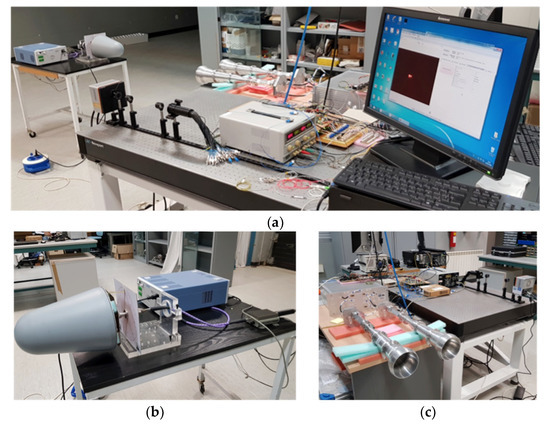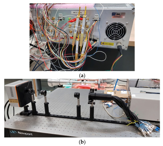 Figure 4a,b shows pictures of the MZM connected to the rear panel of the microwave receiver rack and the OCDS. Figure 4b shows, from right to left, the fiber array, two lenses of 10 cm focal length, an iris, and the near-infra-red (NIR) optical camera. Most of the components of the OCDS, except the camera, are described in Reference [16].