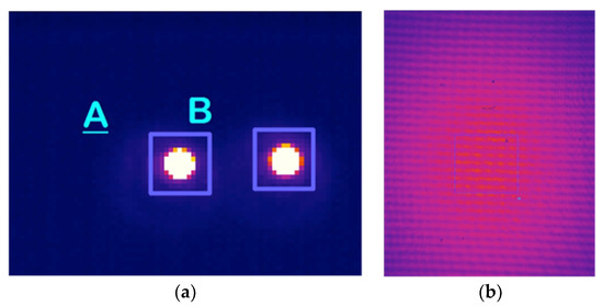 The image synthesized by only two receivers is basically a group of fringes, which is not good enough to be used in actual observations. In order to have a cleaner image, more receivers placed in an optimized configuration should be used to provide an optimal point spread function (PSF) (see References [11,16,21] for more details). On the other hand, the polarization measurement method is basically the same that the one explained in References [17,18] for the QUIJOTE experiment. For the measurement tests, the camera acquisition ratio (frame rate) is set to 100 Hz. The applied polarization modulation phase-switching frequency is 3 Hz, so the complete cycle with 16 phase -states provided by the phase switches (four sequences of 0, 90, 180, and 270 deg. phase-shift between receiver’s branches [17,18]) is repeated approximately every 5.4 s. In order to integrate the power of the Near-Infra-Red signals imaged with the camera, the detected signal level is calculated as the mean value in a certain number of camera pixels, where the up-converted signals are imaged (direct imaging) or the maximum of the synthesized image power is found (interferometry). Figure 7 shows two pictures of the images achieved when operating in both modes and the pixel areas selected to measure the average signal level.