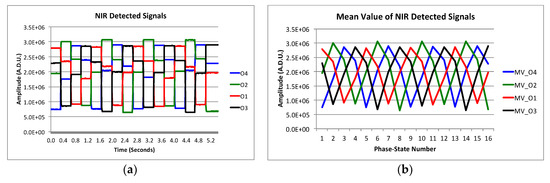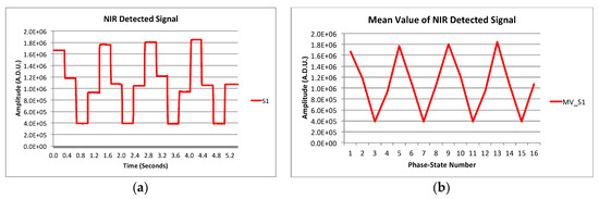 (a) NIR detected signal levels with electronically polarization modulation using the phase-switching stage of the receivers. (b) Resulting waveform from each phase-state mean value.