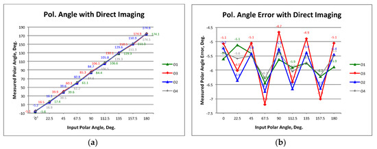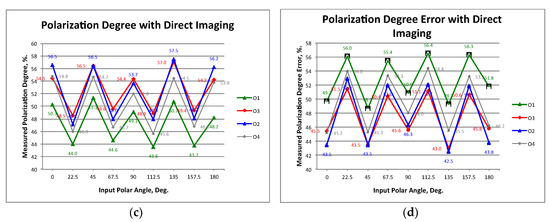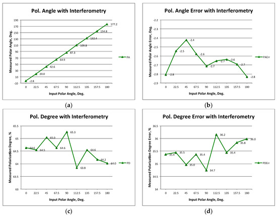 Again, the amplitude and phase of the polarization vector are extracted as in direct imaging operation mode. Figure 11a–d shows the measured polar angles and their errors, and also the achieved polarization percentages and their errors. It can be seen that the polar angle errors and the polarization degree errors are around −2.6 degrees and 35.5%, respectively. It is noticed that the errors are lower than in the direct image operation mode, and this is one of the most important advantages of this type of operation with respect to the previous one. Nevertheless, the polarization degree error is still important, but, as in the previous case, a calibration methodology with specific application to this kind of instrumentation needs to be applied.