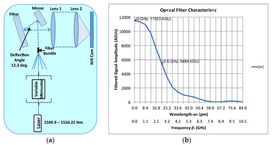 In the reported demonstrator, a carrier rejection optical filter has not been included for simplicity and because, with only two receivers, it is not possible to achieve a good quality synthesized image (only a group of fringes can be obtained). However, for a general case with a higher number of receivers, the use of optical filters to reject the undesired part of the modulated optical signals is required, not only to improve the polarization degree characterization, but also to be able to generate synthesized images with the required quality to be used in the actual CMB experiments. Figure 12a shows a sketch of the measurement test bench implemented to test a volume bragg optical filter (VBF) at “Instituto de Astrofísica de Canarias” (IAC) laboratory. It can be seen that the filter operates in reflection with a nominal deflection angle that can be slightly modified to tune the filter central wavelength (wC) or frequency (fC).
