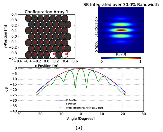 The most relevant additional factors influencing the quality of the synthesized image are the number and distribution of the receivers and the correct homothetic mapping between the horns and the fiber array. The homothetic mapping refers to the common geometry of the antenna and fiber arrays being related by a simple scaling factor. The similarity of both geometries is not perfect due to some misalignments in the fiber array. An antenna mechanical support precisely reproducing the fiber array configuration can be implemented to enhance this situation. Finally, regarding the number and distribution of receivers, Figure 13 shows synthesized beam (SB) simulation results.