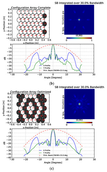 Synthesized beam simulation results. White circles of top-left panels represent active receiver horn antennas and bottom panel shows the X and Y profiles of the synthesized beam (SB) shown in top-right panel. Two-receiver configuration of the reported demonstrator (a); fully populated array configuration with 46 receivers (b); optimized array configuration with 20 receivers (c).
