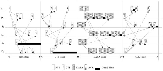 The proposed method follows the basic handshaking mechanism where the channel is reserved by the control packets of RTS and CTS. Time stamps are added to each control packet for synchronization. Because there is no central node to control the transmission, the source and destination nodes are synchronized through dedicated control packets, whose time stamps are unique in the transmission. A transmission cycle consists of four stages: the RTS stage, CTS stage, data stage, and acknowledgement (ACK) stage, as shown in Figure 1. In Figure 1, S1, S2, and S3 are the source nodes and D1, D2 and D3 are the corresponding destination nodes. The solid arrows represent the transmission to the recipient of a packet and the dashed arrows represent the transmissions to the other nodes that will also listen the packet.