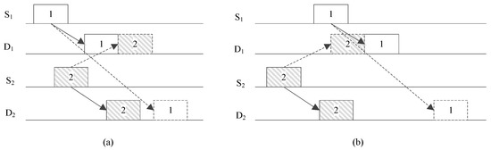 In previous studies, scheduling was usually implemented in a sender- and/or receiver-initiated manner for content-based networks, where a sender or receiver can receive multiple packets from different nodes. In these protocols, the effect of the sending sequence was insignificant. However, in the proposed protocol, multiple senders send packets to their corresponding receivers in a transmission cycle, which means the sending sequence is important to the transmission efficiency due to the unequal propagation delays among nodes. Figure 2 provides an example of two concurrent transmissions with different sending sequences. The total transmission time is much shorter when S1 sends the packet before S2. Therefore, in the proposed protocol, the sending sequence and times of the source nodes both must be optimized. In this section, we first consider the optimization of the sending time of the source node when the sending sequence is given. Then, a dynamic programming-based algorithm is proposed for the joint optimization of the sending sequence and time of the source nodes. To satisfy the synchronization requirement, no stochastic algorithm is used in the optimization.