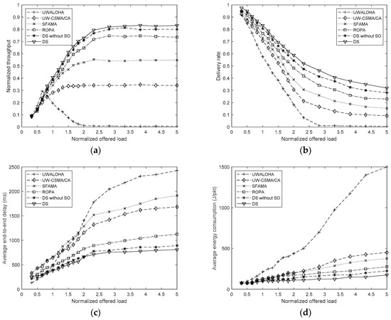 The performance of UWALOHA, UW-CSMA/CA, SFAMA, and ROPA protocols, and the proposed method under different network loads are shown in Figure 3, where “DS” and “DS without SO” denote the proposed distributed scheduling method with and without sending sequence optimization, respectively.