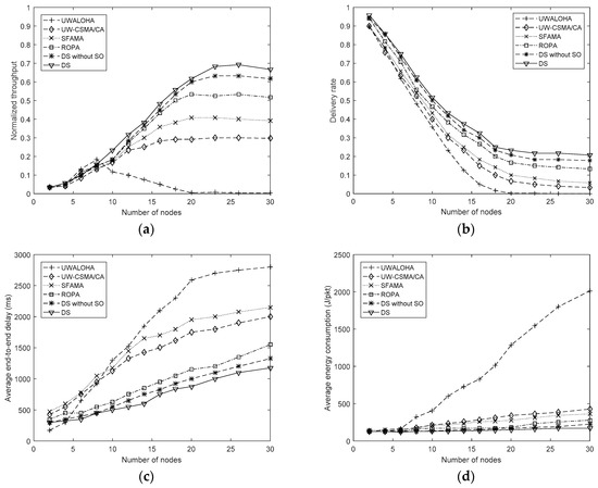 Figure 4a shows that UWALOHA achieves the highest throughput when the number of nodes is less than 8 but drops quickly as the network size increases. UW-CSMA/CA, SFAMA, and ROPA reach their maximum throughput of 0.30, 0.40, and 0.53, respectively, at the network size of 20. The throughputs of DS and DS without SO become saturated after the network size reaches 26. They achieved the maximum throughputs of 0.70 and 0.65, respectively, which were the highest in the simulation, because the proposed method provides more concurrent transmission opportunity so that more nodes can transmit their data in one transmission cycle. DS also outperformed DS without SO in the simulation results.