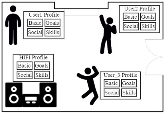 Figure 1 shows a simple example of a living room in which there is a small party with three people and a smart HIFI system. Each person, through his/her smartphone, has a virtual profile detailing historical contextual information (e.g., the music he/she usually plays, her/his location, etc.), her/his preferences (e.g., her/his musical interests in each specific location), and her/his goals (e.g., listen to specific music styles). The smart HIFI system has its own virtual profile detailing historical contextual information (e.g., the music it has played), the goals it has (e.g., to save energy), and its skills (e.g., to play music). The situational context would be the composition of the four virtual profiles. From this composed virtual profile, the strategy to coordinate the different entities and identify what functionalities/skills should be executed are identified at run-time. Concretely, the music style and, even, the concrete songs that the HIFI system should play would be detected. The different subsets of information constituting the virtual profiles also allow us to address some problems related to the devices’ heterogeneity, since devices communicate, exchange information, and interact on the basis of two fixed concepts: goals and skills. This allows us to transmit information and coordinate the actions that must be done considering their specific capabilities. Some initial work in this direction has already been published in [33].
