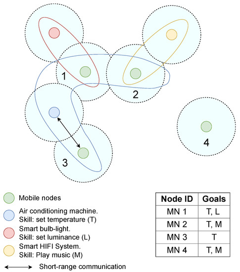 In order to better understand the concept of OCVN, Figure 2 shows an example where seven IoT nodes coexist in the same geographical area and three different OCVNs are created. Green nodes are mobile nodes (e.g., smartphones), and their goals are described in the table shown at the right side of the figure. Regarding the set of fixed heterogeneous IoT nodes, they represent an air conditioning machine with the skill of setting the temperature, a smart light-bulb to adjust the luminance, and a smart HIFI system able to play music according to musical preferences. In this example, we assume that the coverage range, represented by dashed-line circles, is the same for each node, and a short-range communication is performed when two nodes get in contact. Colored lines represent the limits of each OCVN. It can be seen that, although Mobile Node 4 (MN4) is isolated, and hence it does not belong to any OCVN, it can still store information about the last OCVN it joined. For instance, if it is moving towards the south of the scenario, it could have belonged to the yellow OCVN in the past since one of its goals was a specific type of music. In this way, MN4 is able to store information of such OCVN during a predefined period of time to be potentially shared with other nodes in the future.