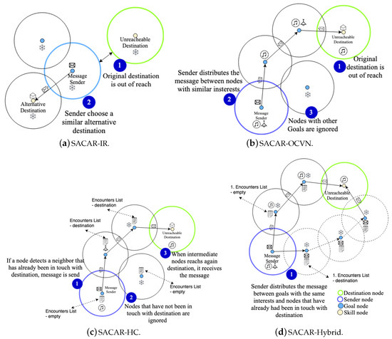 Four different versions of the SACAR-based algorithm are proposed (Figure 3) taking into account different contextual information for delivering a message (i.e., they are in contact, they share some interests, or they have previously been in the range of the destination node), namely (i) SACAR-In Range (SACAR-IR), (ii) SACAR-Opportunistic Context Virtual Networks (SACAR-OCVN), (iii) SACAR-Historical Contacts (SACAR-HC), and (iv) SACAR-Hybrid. Next, the main insights of each version are described: