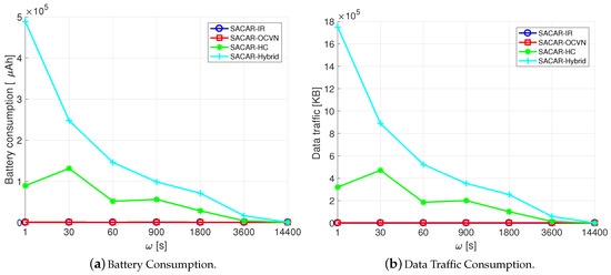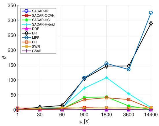 The second metric we aimed to analyze is the overhead ratio, , which is reported in Figure 9 as a function of . From the figure, we can extract that, apart from the solutions that do not consider the possibility of relaying messages (SACAR-IR and DDR) where no overhead was experienced (), SACAR-OCVN, SWR, and GSaR presented a similar flat trend with low values of independently of the value of . This means that a very small gap between the number of relayed messages with respect to the number of delivered ones was obtained. Therefore, nodes’ resources such as buffer occupation and energy consumption due to forwarding actions were not highly impacted because of the use of these algorithms. Instead, a clear increase in the value of with respect to was experienced when using MPR and ER. The spreading logic behind these solutions, where several copies of the message are created under different circumstances, severely impacted the network performance in terms of overhead ratio.