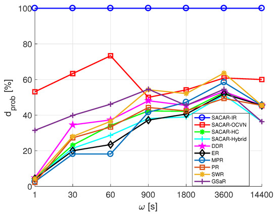 The first network metric we aim to analyze is the average delivery probability. The resulting values of as a function of are reported in Figure 12. Remarkably, SACAR-OCVN again outperformed the rest of the algorithms, especially for low values of . In fact, the best gains were obtained when messages were continuously generated and the network traffic was high ( of gains when s). Although SACAR-OCVN slightly decreased with , it was almost stable and always above . On the contrary, the rest of the algorithms presented an increasing trend as a function of , but their outcomes were worse than the ones obtained when applying the concept of OCVN. Among them, GSaR must also be highlighted because it provided better results for . In fact, for = 14,400, it presented even better results than SACAR-OCVN.
