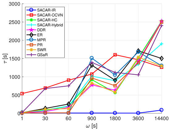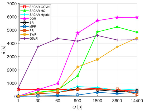 Figure 13 reports the values of as a function of . From the results, we can highlight that a division of the algorithms into two groups according to their behavior respecting can be done. At first, there were four solutions (DDR, SACAR-HC, GSaR, and SWR) for which the average time a message spent inside a relaying node increased with , reaching prohibitive results when the time period between consecutive rounds of message generation was high. On the contrary, there was no impact on when was varied for the rest of algorithms. If we focus on our best solution in terms of delivery probability, i.e., SACAR-OCVN (see Figure 12), we can state that, although the logic of the algorithm restricts the number of nodes that can be used for relaying a message (there must be a goals/skills matching), and therefore messages must spend longer times in buffers, results reported in Figure 13 indicate that these times are comparable with solutions where such a constraint is not taken into account and where messages can be relayed by any node found along the path.