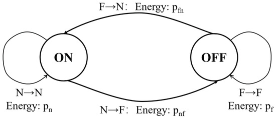 Since we assume the consumed energy of state and switching states are zero, i.e., , we derive the simplified formulation as Equation (3).