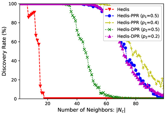 Number of neighbors. In a star network, the central node has neighbors and it selects duty cycle . We select Hedis as the example and set for PPR and DPR. Figure 4 shows the discovery rate (y-axis) of within time slots when (x-axis) increases from 1 to 100. From the figure, (bare) Hedis cannot discover all neighbors when , and it cannot find even one neighbor when . Modified by PPR and DPR, all neighbors can be discovered when and , respectively. We also evaluate the performance of PPR and DPR at and , and they outperform the methods when .