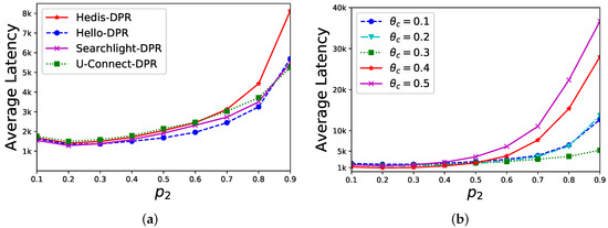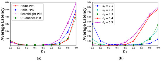 Sensitivity of . In a star network, the central node has neighbors (we set since the bare algorithms fail to find any neighbor) and we evaluate PPR’s performance under different values of . As shown in Figure 5a, is set to and the average discovery latency (y-axis) of different algorithms is changed by different values of (x-axis). When , the performance is better. In Figure 5b, we select U-Connect as the example and set as , respectively. The average discovery latency is changed by different values of (x-axis), and the performance is also better when approaches . Overall, our discovery latency is stable when .