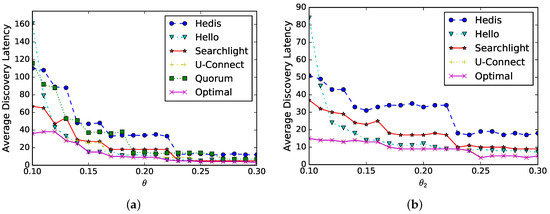 Symmetric duty cycle: suppose two neighbors select the same duty cycle that increases from to , we evaluate the average discovery latency in Figure 9a. As shown in the figure, the discovery latency (y-axis) of all algorithms decreases as (x-axis) increases, and they have similar performances. This is because the discovery latency is proportional to and the trends of these curves match the analysis. Finally, the optimal schedule can be generated automatically; for example, U-Connect is selected when , while Hello is selected when .