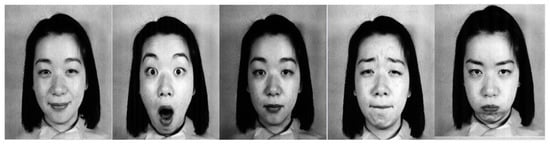 - Lucey, P.; Cohn, J.F.; Kanade, T.; Saragih, J.; Ambadar, Z.; Matthews, I. The extended cohn-kanade dataset (ck+): A complete dataset for action unit and emotion-specified expression. In Proceedings of the 2010 IEEE Computer Society Conference on Computer Vision and Pattern Recognition-Workshops, San Francisco, CA, USA, 13–18 June 2010; pp. 94–101. [Google Scholar]