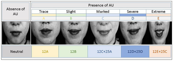 FACS manual gives an insight into the inherent relationship between the AUs that can produce the required information for measuring and analyzing the emotional intensity. The manual mentions that the inherent relationships can be subdivided into two classes—the class of mutual exclusions and the class of co-occurrences. Here, the class of co-occurrences is a class of groups of AUs which generally and most frequently appear together to give meaning to the depicted facial emotions. For example, AU6 + AU12 + AU25 suggest “happy” while AU4 + AU15 + AU17 depict “sad”. In the case of mutually exclusive AUs, the FACS manual provides alternative rules. Mutually exclusive AUs rarely occur together in spontaneous emotions in day-to-day life. FACS mentions that it is difficult to demonstrate two AUs such as AU25 (lips apart) and AU24 (pressed lips) together at all. This suggests that the mutually exclusive cases are very much possible, but with very low probability. There are still few limitations to the co-occurrence class in terms of intensity levels of emotion AUs. For example, when AU6 (raised cheeks) occur with AU12 (lip corner puller) as shown in Figure 5, both the AUs present a high/low-intensity level of one another.