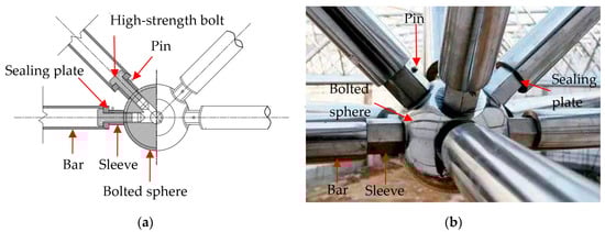 Bolted spherical joints (BSJs) have been widely used in different kinds of space grid structures such as theaters, exhibition centers, airport terminals, highway toll stations, and even structures in space [1,2,3]. BSJs have the advantages of high installation accuracy, good bearing capacity, and flexible connection directions [4,5]. Figure 1a shows a diagram of bolted spherical joint parts. With screwing the sleeve, the high-strength bolt is driven to connect the bar with the bolted sphere successfully. Figure 1b shows the practical application of a bolted spherical joint of the roof at Qingdao airport terminal-A. From Figure 1b, the high-strength bolt is invisible outside the joint, which leads to the difficulty in monitoring the internal bolt looseness. Moreover, the bolt looseness causes the reduction of the local stiffness and bearing capacity for the structure [6,7,8,9]. With the passage of time, the failure of the joint connection, which is often a brittle failure without any indication, is likely to occur suddenly, consequently, leading to serious failure of the structure. Therefore, it is necessary to develop a real-time and effective monitoring technique for the looseness of the bolted spherical joint connection.