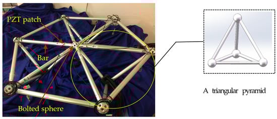 To verify the feasibility of the EMI and BPNNs-based SHM technique for looseness monitoring of bolted spherical joint connection, the experiment was conducted on a space grid specimen. Figure 3 depicts the geometry details of experimental specimen. The steel material used was Q345. The specimen was composed of three triangles on triangle offset units. The dimensions of bars were Φ22 mm by 6 mm. The dimensions of bolted spheres were Φ46 mm by 10 mm. In order to simulate the fixed support, clamps were used to fix the specimen on the experimental table. The thick sponges were used to separate the specimen from the clamps in order to improve the experiment’s accuracy.