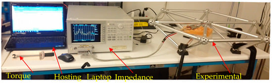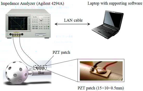 Figure 5 shows the EMI measurement system. It was composed of an impedance analyzer (Agilent 4294A, Keysight Technologies, Santa Rosa, CA, USA), a laptop with supporting software and a PZT patch. The PZT patch, which has a size of 15 mm by 10 mm by 0.5 mm, was bonded very close to the bolted sphere on the surface of the bar using epoxy resin. At first, we sanded the bonding area on the surface of the bar in order to improve the bonding. Then, the PZT patch was bonded very close to the bolted sphere on the surface of the bar using epoxy resin. At last, we used epoxy resin to reinforce the entire bonding area from the outside. The detailed dimensions of the location of PZT patch is shown in Figure 6. The high-frequency AC electric field (i.e., converse piezoelectric effect) was applied to the PZT patch by the impedance analyzer and the mechanical vibration was generated on PZT patch. Accordingly, the connected bar also vibrates. Conversely, the vibration of bar causes the PZT patch to produce the electrical responses (i.e., direct piezoelectric effect), which was represented by the change of electrical impedance for the PZT patch. The electrical impedance signatures of the PZT patch were measured by the impedance analyzer and were stored in the computer. By comparing the electrical impedance signatures of PZT patch before and after damage, the bolt looseness was monitored. Figure 7 shows the experimental setup.