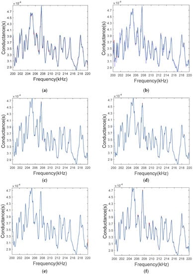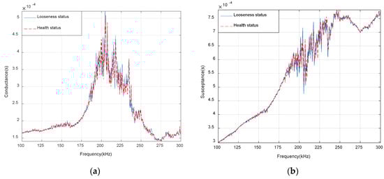 For the EMI–based SHM technique, the accuracy of the monitoring results is closely related to the sensitive frequency range and the measured signature. The resonant frequencies of the patch were 200–250 kHz. In order to select a suitable frequency range, the PZT patch on the specimen was scanned over a wide frequency range of 100–300 kHz. The conductance and susceptance signatures, which are the real part and imaginary of admittance, of the PZT patch between healthy and looseness status are shown in Figure 8a,b. There are 801 sampling points in the signature spectra. The admittance is the reciprocal of impedance. Figure 8a shows that the conductance signatures have multiple sharp peaks in the frequency range between 200–220 kHz. Compared with Figure 8a,b, it can be seen that the conductance is more sensitive than the susceptance. This is due to the fact that the susceptance is dominated by the capacitive response of the sensor and thus is less sensitive to the changes in the mechanical properties of the structure [75]. Therefore, the frequency range of 200–220 kHz was selected as the sensitive frequency range and the conductance was selected as the measured signature in the following study.