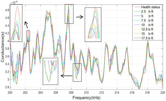 According to the experiment procedure described in Section 3.2, different looseness degrees with an increasing torque level from 3.39 N·m (2.5 lb·ft) to 23.75 N·m (17.5 lb·ft) with increments of 2.5 lb·ft were considered. Figure 9 shows the conductance signatures over the sensitive frequency range of 200–220 kHz for different looseness degrees. It can be seen that each torque level is separable from others with the curves.