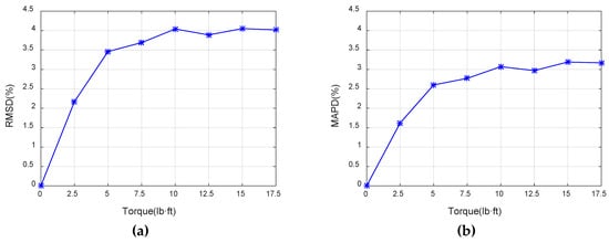 (a) The root-mean-square deviation (RMSD) of conductance signatures at different torque levels; (b) The mean-absolute-percentage deviation (MAPD) of conductance signatures at different torque levels.