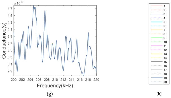The conductance signatures for twenty repeated experiments at different torque levels. (a) 2.5 lb·ft, (b) 5.0 lb·ft, (c) 7.5 lb·ft, (d) 10.0 lb·ft, (e) 12.5 lb·ft, (f) 15.0 lb·ft, (g) 17.5 lb·ft, (h) Repetitions (in No.).