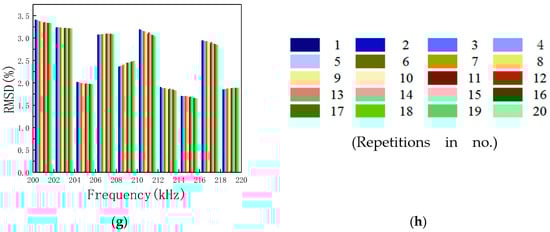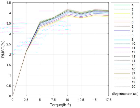 The RMSD values of ten sub-frequency bands at different torque levels for twenty repeated experiments (a) 2.5 lb·ft, (b) 5.0 lb·ft, (c) 7.5 lb·ft, (d) 10.0 lb·ft, (e) 12.5 lb·ft, (f) 15.0 lb·ft, (g) 17.5 lb·ft, (h) Repetitions (in No.).