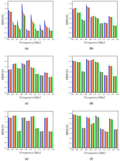 The bolt looseness was quantified according to the monitoring indexes (RMSD and MAPD) in this paper. Taking the healthy state as the baseline, the RMSD and MAPD of conductance signatures over 200–220 kHz were calculated using Equations (3) and (4) for each torque level, as shown in Figure 10. As the torque level increases, the conductance-based looseness indexes (RMSD and MAPD) increases. This is due to the fact that greater torque leads to the looser joint connection. Based on the EMI method, the looseness indexes (RMSD and MAPD) can effectively quantify the loosening degree of bolted spherical joint connection. Figure 10 also shows that the RMSD and MAPD looseness indexes have the same trend, and the RMSD value is larger than the MAPD value for the same torque level. We selected the RMSD as the looseness-monitoring index in this research.