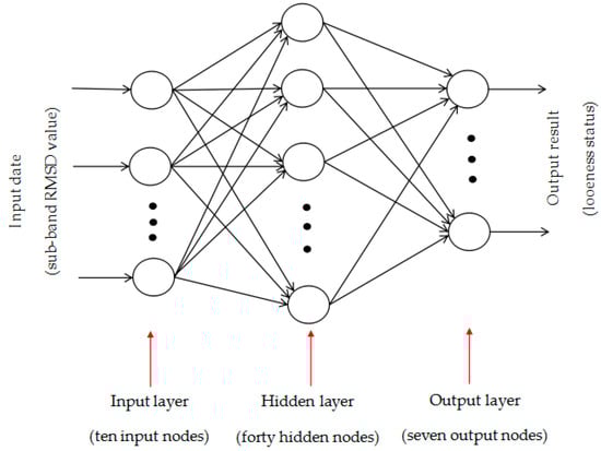 BPNNs has the powerful nonlinear mapping capacity and has wide applications [72,73,74]. The three layers of BPNNs are an input layer, a hidden layer, and an output layer. BPNNs are trained with a momentum, a maximum number of iterations, adaptive learning rate, and a back-propagation algorithm. Essentially, the learning rate is an important factor for the convergence rate of the networks and for the convergence to a global minimum of the objective function. The performance of BPNNs depends on the training samples’ number and multiplicity in the database. In this paper, BPNNs is used to map the nonlinear relationship between conductance signatures and the degrees of bolt looseness. Using the trained BPNNs, the looseness degree of BSJs can be determined.