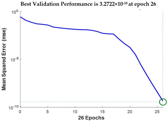 In the twenty repeated experiments, the seventeen experiments were taken as neural networks’ training samples and the remaining three experiments were used as the neural networks’ testing samples. Since there were seven torque levels (i.e., looseness degrees), the total numbers of the training samples and testing samples were 119 and 21, respectively. The training accuracy was 10−10. The adaptive learning rate was 0.01. The momentum coefficient was 0.9. The maximum training number of iterations was 26. The back-propagation algorithm was the gradient descent algorithm. Figure 15 shows the networks training process. The training process is stable and convergent. The networks testing results are shown in Table 1. The trained BPNNs model can correctly identify the looseness degrees of all testing samples.