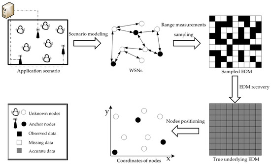 At present, the typical range-based localization methods include two steps: (1) using certain ranging methods to measure the distance between nodes, such as Time of Arrival (ToA), Time Difference of Arrival (TDoA) and Received Signal Strength Indicator (RSSI); (2) using the range measurements combined with the location of anchor nodes to calculate the position information of unknown nodes. The popular localization method called Maximum Likelihood (ML) is asymptotically efficient [14] with enough data records. Tomic et al. [15] built a new convex estimator that approximated the ML by applying efficient convex relaxations, which reduced the estimation errors. In references [16,17], WSNs localization problem is treated as a variant of EDM recovery problem or graph implementation problem. By using the range measurements between nodes and introducing the slack variable to convert non-convex quadratic distance constraints into linear constraints, the authors formulated the WSNs localization problem as a Semi-Definite Programming (SDP) problem, and designed an efficient optimization method to solve the proposed problem. References [18,19] employed the classical MDS method to map the distance relationship between wireless sensor nodes to low-dimensional space, and generated a relative coordinate map which fitted well the distance relationship between nodes. Then, a few anchor nodes were used to convert the relative position to the global position. However, the above methods did not work well in real application scenarios. In general, these methods required complete and accurate EDM. Unfortunately, due to the requirement of energy-saving and the effects of potential node anomaly and complex noise, the existing range-based node localization methods often suffer from incomplete and detorted range measurements. In addition, the ML method and SDP method could be only used to solve a small-scale problem because of its high computational complexity.