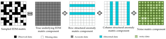 where represents the squared Euclidean distance between the i-th sensor node and the j-th sensor node. Reference [8] has proofed that the rank of matrix is at most , which indicates the EDM matrix has an inherently strict low-rank property. Usually, in practical applications, only a few sensor nodes could obtain their accurate coordinates by loading GPS, and the position information of other unknown nodes need be indirectly calculated by employing some localization methods. Due to irregular node distribution and energy consumption limitation, only the partial range measurements could be collected. Based on the collected incomplete distance measurements, we can only establish a sampled EDM matrix with missing elements. Our goal is to estimate the coordinates of unknown nodes based on the sampled range measurements and the known coordinates of anchor nodes. Figure 1 illustrates the pipeline of node localization for WSNs in complex environments. As shown in Figure 1, the node localization process involves two main steps: EDM recovery and node positioning. At the first step of EDM recovery, by using our proposed RRMD algorithm, we can impute the missing range measurements and obtain the estimated complete EDM matrix, which is also called the true underlying EDM matrix, and then at the second step of node positioning, based on the estimated true underlying EDM matrix, we can further employ MDS method to position each unknown node. Compared to the second step of node positioning, the first step of EDM recovery is more critical and challenging. Specifically, in practical applications, limited by the complex environmental interference, malicious attacks, hardware malfunction, etc., the existence of errors in range measurements is unavoidable, which leads to the destruction of sampled EDM and reduction in localization accuracy. In this paper, we assume that the sampled EDM matrix consists of the true underlying EDM component , the row structural anomaly matrix component , the column structural anomaly matrix component and the noise matrix component , which is illustrated in Figure 2. The noise is considered to be caused by environmental interference, malicious attacks, etc., which usually follows continuous complex distributions. Moreover, the existence of the anomaly is caused by abnormal transmission module or other unpredictable hardware defects. Specifically, when the receiving module of the nodes fails, it will cause row structural anomaly in the corresponding row in EDM, and when the sending module of nodes fails, the corresponding column in the EDM will have the column structural anomaly [8]. To address the above problems, we need to design an efficient method to obtain a true underlying EDM. Finally, based on this EDM, the actual coordinates of unknown nodes could be easily estimated by employing the classic MDS method.