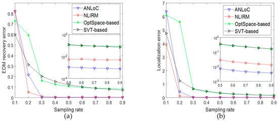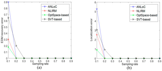This experiment assumed that all observed range measurements were accurate. Figure 3 shows that the variation of the EDM recovery error and average localization error of WSNs nodes when the EDM is sampled at different proportions. The horizontal axis of the two subgraphs represents the sampling ratio, while the vertical axis in Figure 3a represents the EDM recovery error, and the vertical axis in Figure 3b represents the localization error of WSNs nodes. Comparing Figure 3a with Figure 3b, it is obvious to find that the EDM recovery error and localization error are consistent with the trend of the sampling rate. Under this scenario, when sampling rate reaches 0.3, the EDM recovery error and the localization error of these four methods reach a very low level. This shows that the existing methods and the method proposed in this paper can achieve good positioning accuracy under the ideal condition.