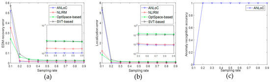 Performance comparison under scenario 3 with only anomaly. (a) EDM recovery error; (b) localization error; and (c) anomaly recognition accuracy.