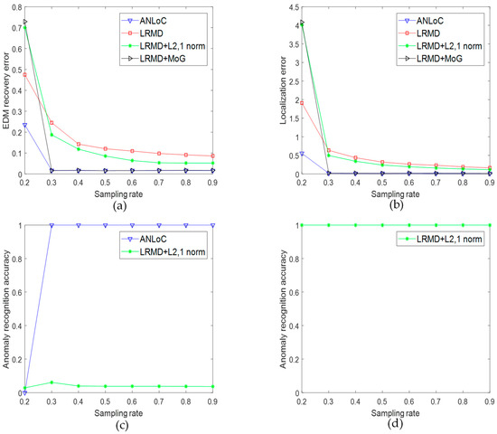 To analyze the effects of our proposed strategies, experiments are designed to compare the proposed method with three partial deleted methods. Actually, our RRMD can be treated as LRMD + MoG + -norm. Then, the remaining three types of partial deleted methods are as follows. (1) Pure LRMD: do not consider any noise or anomaly; (2) LRMD + MoG: only consider complex noise; (3) LRMD + -norm: only consider the anomaly. What’s more, these experiments are set under the scenario with both complex noise and anomaly. Finally, all experimental results are shown in Figure 8a–c. Obviously, our ANLoC considers both complex noise and anomaly, which leads to its low EDM recovery error and localization error. Moreover, when the sampling rate reaches 0.3, it could accurately detect abnormal nodes. Due to too ideal assumptions, pure LRMD is the worst performer, which means that it cannot be applied in actual situation. Although LRMD + MoG could handle the error of EDM well, it does not have the ability to detect abnormal nodes. Specially, LRMD + -norm could hardly detect abnormal nodes in this case. Naturally, we speculate the noise that is not unprocessed may have a negative effect on the performance for detecting abnormal nodes in this method. Therefore, another experiment is designed with LRMD + -norm when the EDM is only destroyed by anomaly, and the result of anomaly recognition is drawn in Figure 8d. The pleasure is that this supplementary experiment validates our conjecture. In conclusion, these experiments demonstrate the effectiveness of the MoG and -norm strategies.