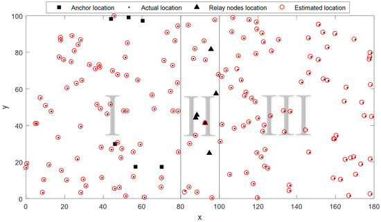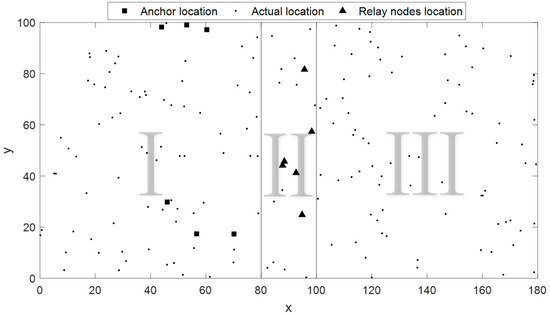 In a practical application scenario, there is a case that when the size of the localization scenario is much larger than ranging length of the sensor nodes and only a few range measurements between inter-nodes could be obtained. As a result of that, the sampled EDM based on range measurements will be very sparse, which leads to poor performance of our method. To solve this problem, a large-scale localization method is proposed in this paper. For the convenience of discussion, we simplify the application scenario as shown in Figure 9. Suppose there is a unit area divided into three parts I, II, and III from left to right, and among them, there are 80, 20, 80 nodes, respectively. Of the 180 nodes, there are 6 anchor nodes and 6 relay nodes. Then, regions I and II are combined into a localization sub-region while regions II and III are combined into a localization sub-region . The large-scale process is as follows. (1) Calculate the actual coordinates of all nodes within sub-region by ANLoC. (2) Based on step one, the actual coordinates of relay nodes are gained. Taking them as anchor nodes, we employ ANLoC again to get the coordinates of the remaining unknown nodes in region .