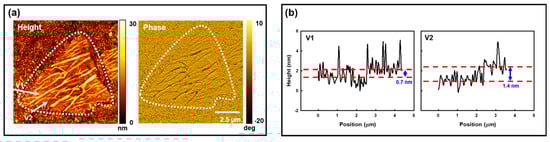 Figure 1. Typical AFM results for a WS2 flake on TSG. (a) Typical AFM height (left) and phase (right) images. The dotted curve is used to outline the WS2 flake. Two vectors (V1 and V2) are shown in the height image. (b) Typical height profiles along the V1 (left) and V2 (right) vectors shown in panel a. The V1 and V2 vectors traverse largely single- and two-layer regions, respectively.
