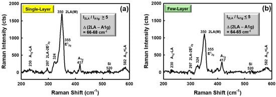 Figure 2. Typical single point Raman spectra and band assignments for different areas on a WS2 flake on TSG. (a) Single-layer region. (b) Few-layer region.