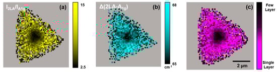 Figure 3 presents typical Raman-based mapping results from an isolated WS2 flake on TSG. Figure 3a,b illustrate the I2LA/IA1g- and Δ-based maps, respectively (the original 2LA and A1g intensity and position maps can be found in the Supplementary Materials in Figures S1 and S2). Figure 3c presents a layer count map created by multiplying Figure 3a,b. An inspection of these data shows that this particular WS2 flake has a center region that consists of few-layer (mostly two-layer) WS2 and the flake remainder is composed, largely, of single-layer WS2.