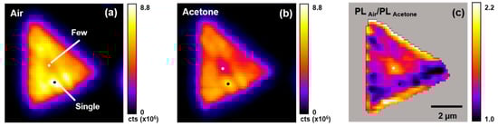 Figure 4 presents typical total PL emission intensity (1.8–2.1 eV) maps for the WS2 flake shown in Figure 3 under air (Figure 4a) or acetone vapor atmospheres (Figure 4b). Two specific locations on this WS2 flake are labeled in Figure 4a, denoting regions that are composed of single- (black circle) and few-layer (white circle) WS2. These locations were selected based on the material classification scheme shown in Figure 3. Figure 4c presents the PL intensity ratio (PLAir/PLAcetone) map from the data in Figure 4a,b. An inspection of these data shows that the PL emission intensity: (i) Is heterogeneous across the WS2 flake when it is under air or acetone vapor, (ii) is generally quenched by acetone vapor, and (iii) quenching is heterogeneous across the WS2 flake. The largest extent of PL quenching is observed at the flake’s middle and upper and lower edges, where the flake is mostly composed of few-layer WS2 (cf., Figure 3). Thus, there is a strong spatial dependence in the acetone-induced PL emission quenching from a WS2 flake.
