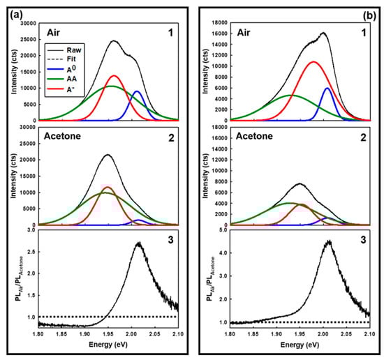 Figure 9 summarizes the impact of acetone vapor on the A0, AA, and A exciton emission bands from an individual WS2 flake on TSG. Several aspects of these results merit further discussion. In a general sense, the response depends on the emission exciton type and WS2 layer number. The A0 exciton from single-layer WS2 exhibits the highest acetone-induced quenching sensitivity (PLAir/PLAcetone up to 20). The A0 exciton from few-layer WS2 exhibits an acetone-induced quenching sensitivity that is generally 1/4 the corresponding single-layer value. The AA exciton from single-layer WS2 is only 1/3 as sensitive (PLAir/PLAcetone up to 7) to acetone-induced quenching in comparison to the single-layer A0 exciton. The AA exciton from few-layer WS2 is not particularly sensitive to acetone-induced quenching (1.0 > PLAir/PLAcetone < 1.5). The A exciton exhibits unique PL emission behaviors. The A exciton from few-layer WS2 exhibits only modest acetone-induced quenching sensitivity (1.1 > PLAir/PLAcetone < 1.5). Interestingly, the A exciton band from the lion’s share of single-layer WS2 is the only band within the flake to exhibit an acetone-induced PL emission enhancement (0.1 > PLAir/PLAcetone < 0.5). It is well known that acetone acts as an electron donor in the presence of MoS2 and WS2 [9,15,27,28]. A previous study on MoS2 [15] shows that the positive trion (one electron, two holes, A+) band amplitude decreases in the presence of an electron donor, and the authors reasoned that when additional electrons are introduced from an electron donor, the PL spectrum is suppressed because of dissociation of the positive trions from the neutral excitons (A0). We determine the enhancement seen in our results is from the negative trion (two electrons, one hole, A) accepting additional electrons from the electron donor, which results in an increase in the PL spectrum for the A.