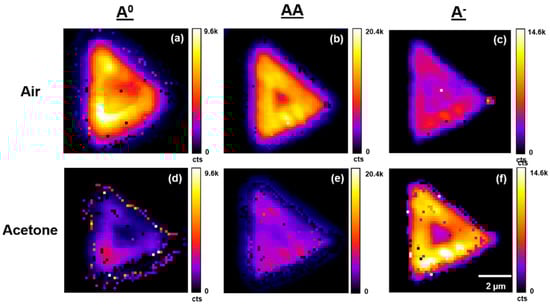 Figure 6. Typical PL emission A0, AA, and A exciton band amplitude maps for a single WS2 flake on TSG under air and acetone vapors. Maps are generated by curve fitting PL emission spectra at each pixel across the entire flake. (a,b,c) Maps in air. (d,e,f) Maps under acetone vapor.