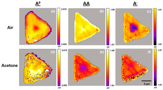 Figure 7. Typical PL emission A0, AA, and A exciton band maxima (eV) maps for a single WS2 flake on TSG under air and acetone vapors. Maps are generated by curve fitting PL emission spectra at each pixel across the entire flake. (a,b,c) Maps in air. (d,e,f) Maps under acetone vapor.