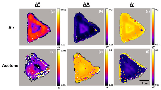 Figure 8. Typical PL emission A0, AA, and A exciton band FWHM (eV) maps for a WS2 flake on TSG under air and acetone vapors. Maps are generated by curve fitting PL emission spectra at each pixel across the entire flake. (a,b,c) Maps in air. (d,e,f) Maps under acetone vapor.