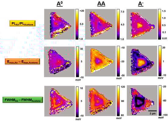 Figure 9. Typical acetone vapor-dependent PL emission A0, AA, and A exciton band intensity ratio (PLAir/PLAcetone), band energy maxima difference (Emax,AirEmax,Acetone), and band FWHM energy difference (FWHMAirFWHMAcetone) maps for a single WS2 flake on TSG.